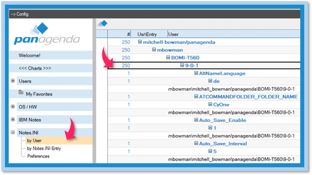 This section provides you with an overview of all your Notes.ini files. The information can be sorted in various ways: User, by the Entry, and by Preferences.