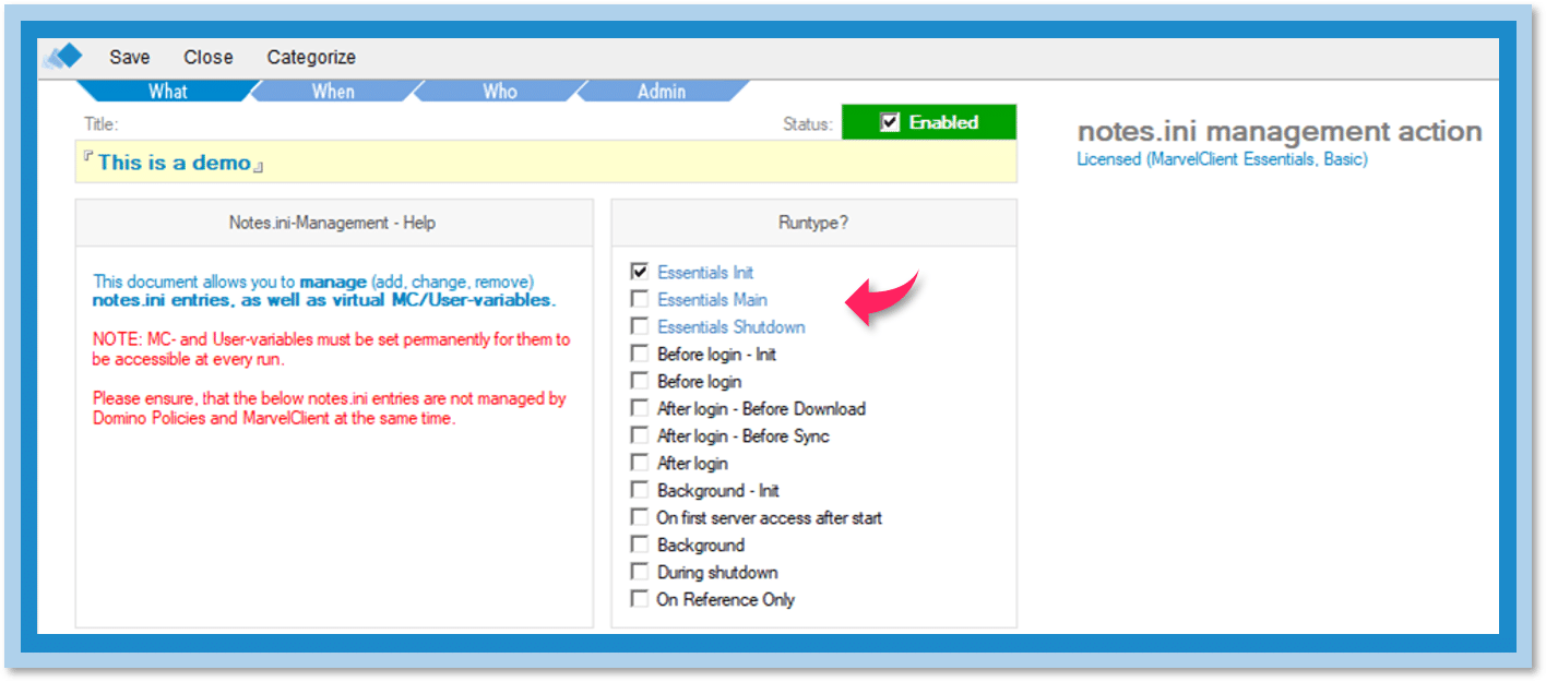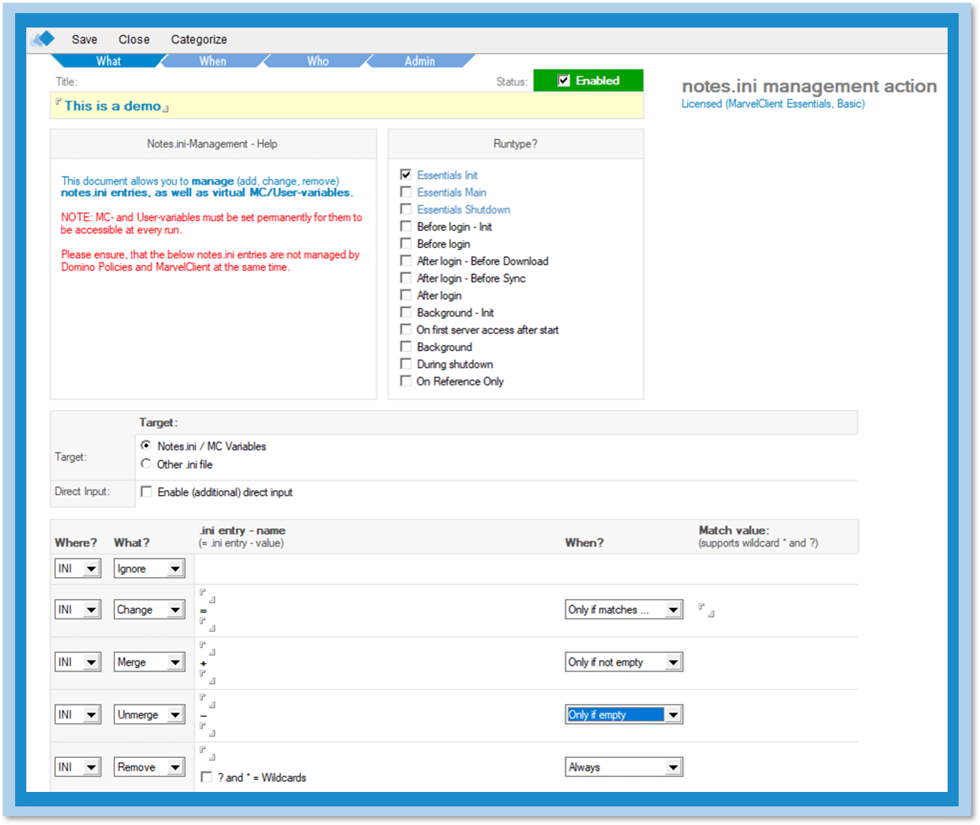 As promised, MC Essentials adds to your ability to maintain your .ini files. You still have access to all the functionality you know from Domino Policies.