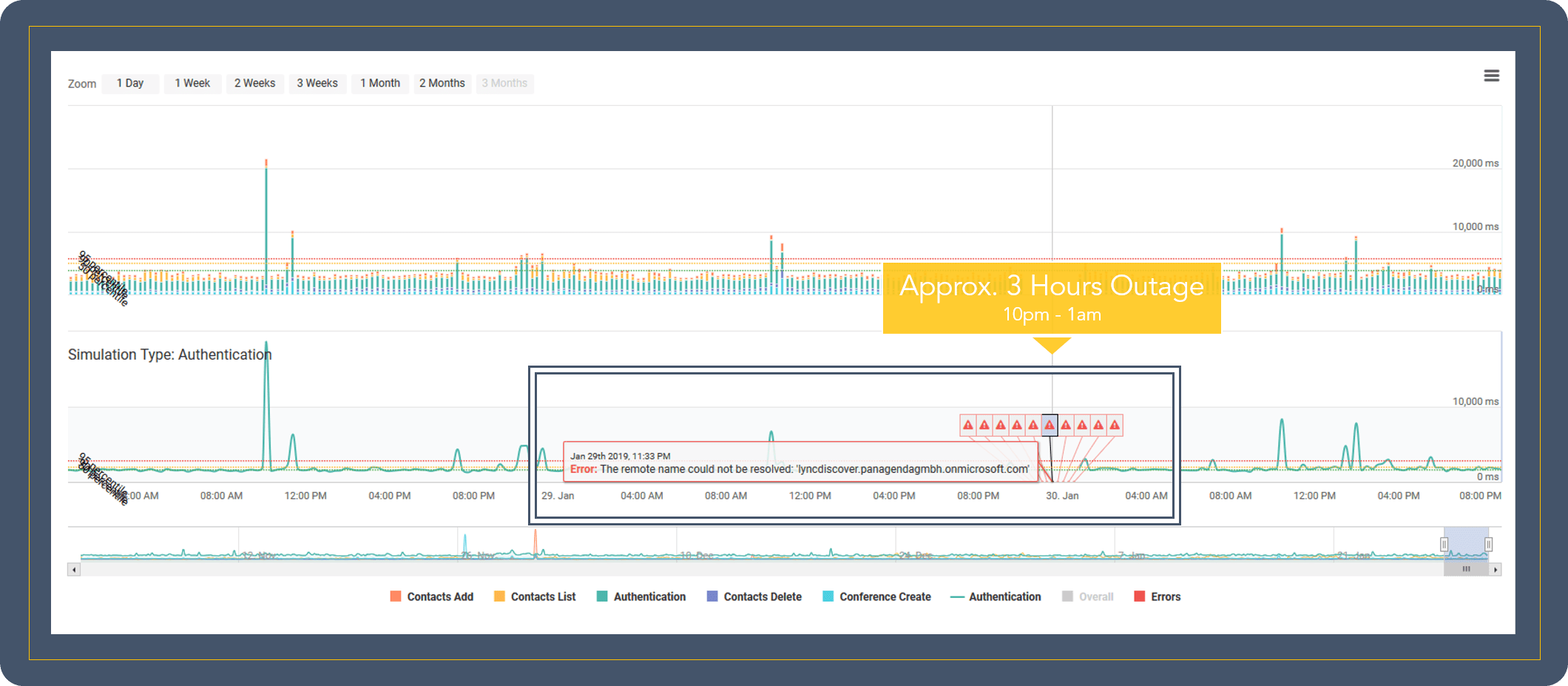 The following screenshot shows how OfficeExpert has seen and measured this outage. The Skype for Business Service had a downtime of almost 3 hours. Other services such as Exchange Online were impacted for around 1 hour. The failure indicator (error message in the screenshot) states that a certain full qualified domain name could not be resolved. This matches exactly with the root cause statement by Microsoft.