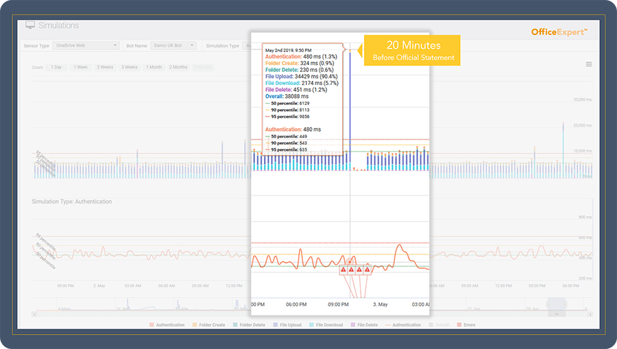 In the screenshot below, it can be seen that OfficeExpert identified an outage at 9:50pm CEST. This was a full 20 minutes before the first Microsoft communication was sent.*