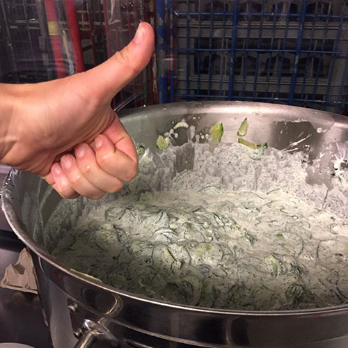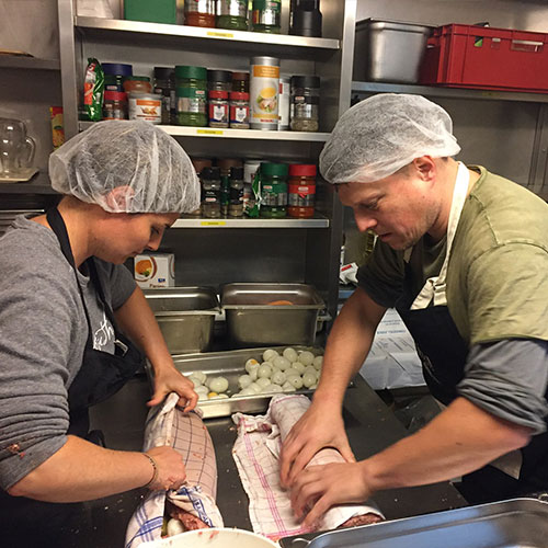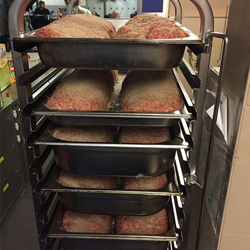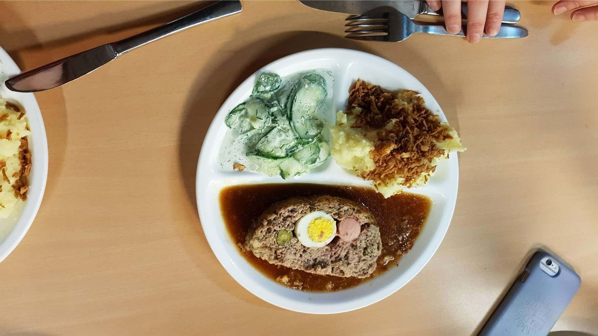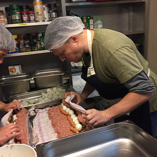 Finally, we transported about 25 large roasts filled with eggs, pickles and sausages into an industrial convection oven. But the work was not yet done – the cucumber salad had its final touches and the ready-mash and sauce still had to be mixed together.