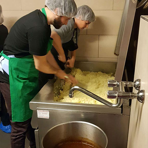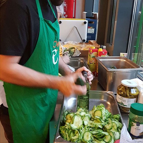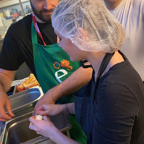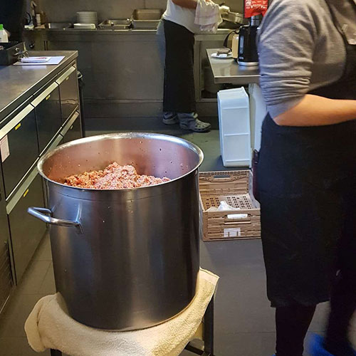 After we all gathered on site, there was a quick briefing to allocate roles. The teamwork experienced across 3 different company departments was phenomenal. We cooked 100 eggs, chopped 5 kilos of onion, mixed 40 kilos of minced meat in huge vats and sliced 90 cucumbers.