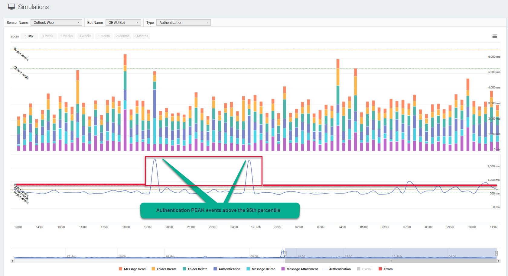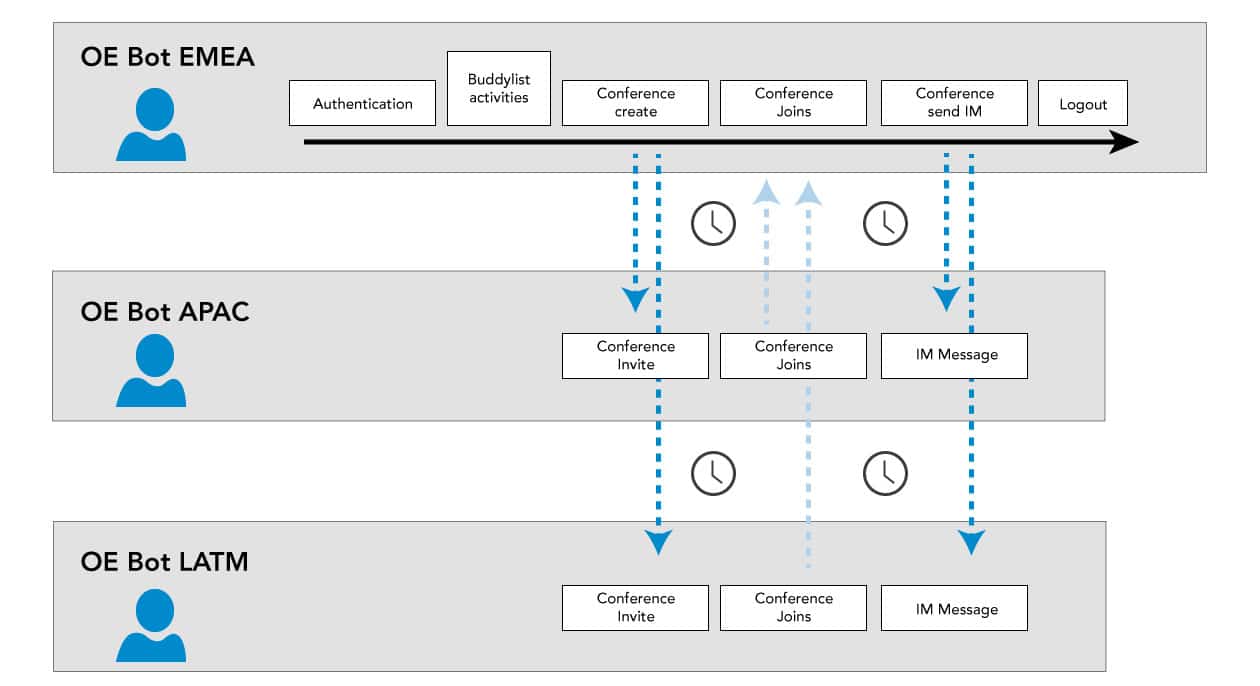 It was also important to us that our QoS simulations perform more than just stand-alone checks. That’s why our bot simulations have the ability to perform so-called Smart Measurements. An example of a Smart Measurement is measuring the performance of Skype for Business conferences regularly and from different locations with 1-n participant bots.