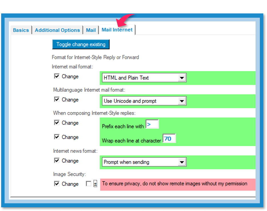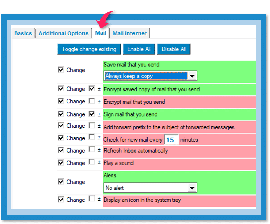 The Mail tab works the same as the Basics tab. Here, though, you are specifically controlling functions relevant for emails.