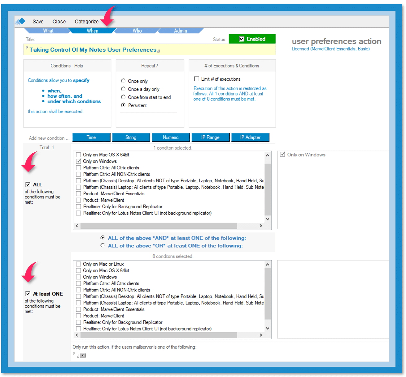 Using the When tab, you can define conditions that control where and how your changes are applied. You can also define the time and the frequency when changes should be applied.