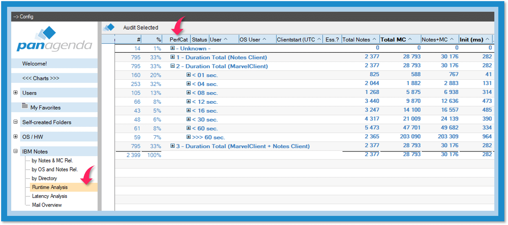 This displays the number of seconds used by each Notes/MC/Notes+MC to start, shutdown and execute various procedures. Use this to identify network performance issues.