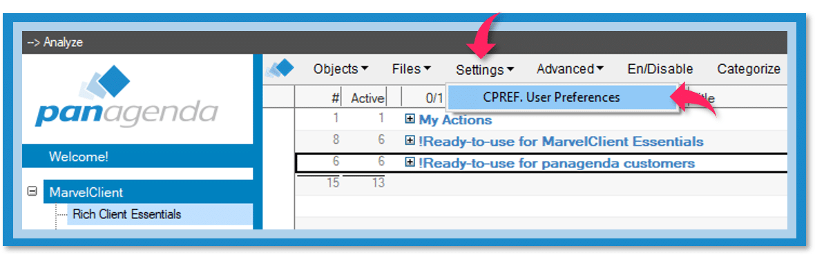 Selecting Rich Client Essentials gives you access to some drop down menus. Now, choose Settings and then CPREF, User Preferences.