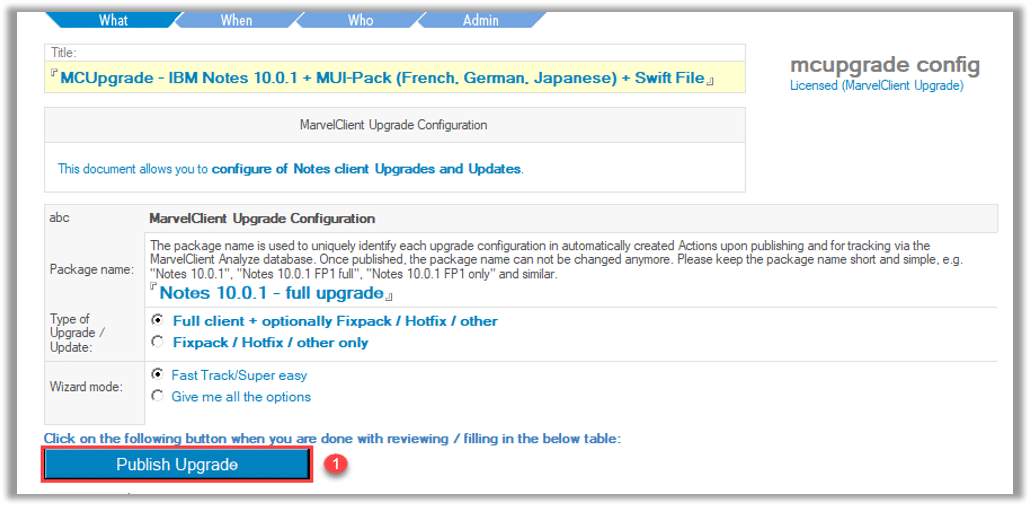 You’re almost done! Publishing the “Upgrade Configuration” creates everything MarvelClient needs to upgrade your current version of Notes to 10.0.1.