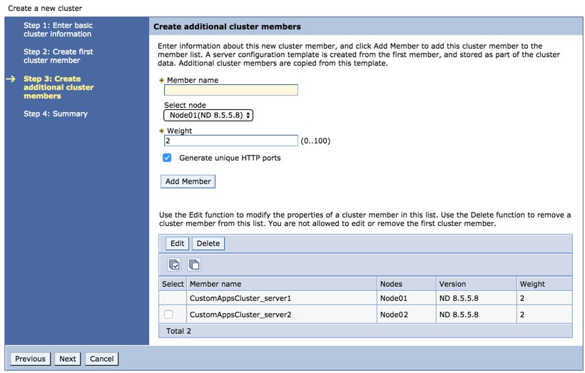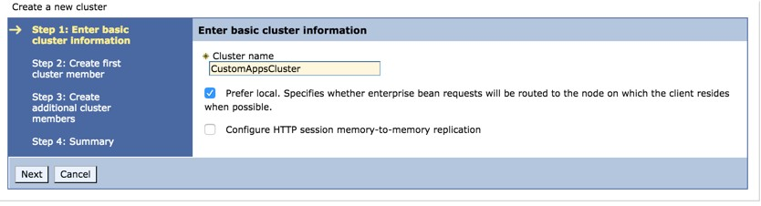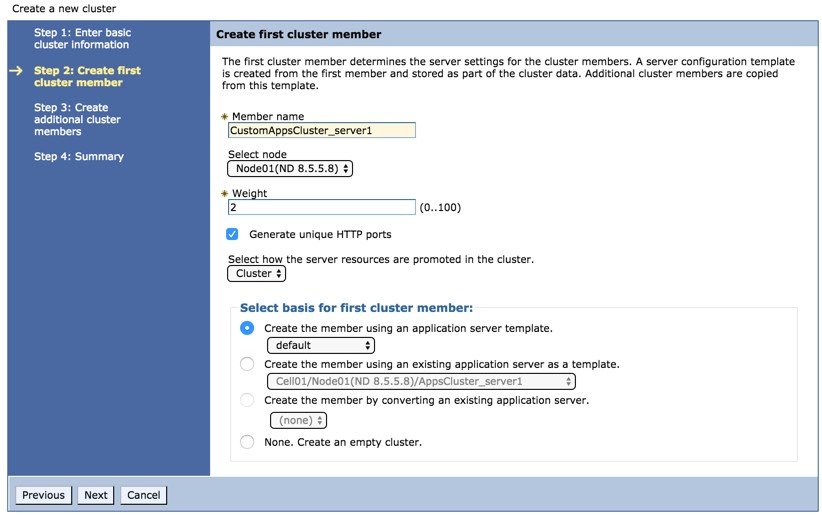 In the WebSphere Integrated Solution Console (ICS) go to Clusters > WebSphere Application Clusters. Create a cluster with one or optionally more nodes.