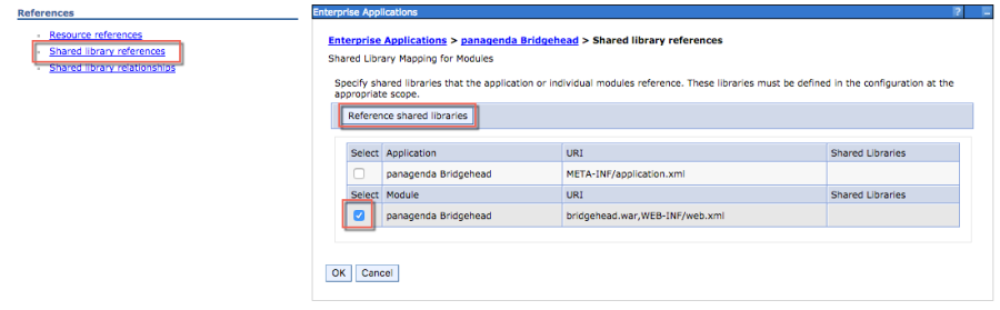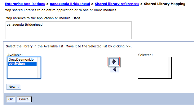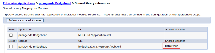 In the ICS go to Applications > Application Types > WebSphere Enterprise Applications, select panagenda Bridgehead and set Shared library references to "pbhJython"