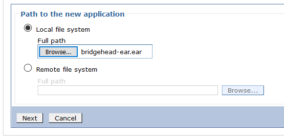 In the ICS go to Applications > Application Types > WebSphere Enterprise Applications, click the Install button and select the path to the file bridgehead.ear: