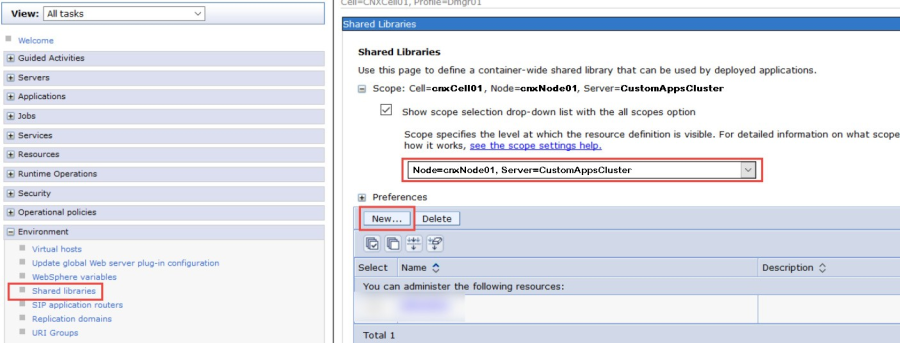 Go to Environment > Shared Libraries, select the scope on which your Bridgehead should run (CustomAppsCluster) and click on the New... button: