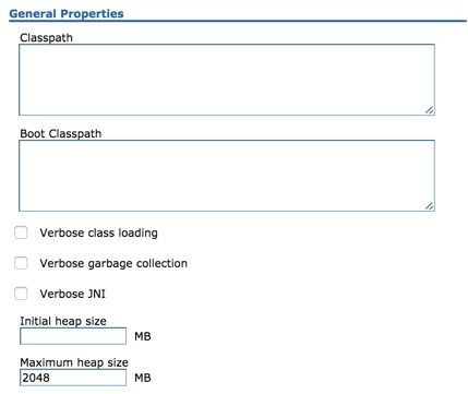 After creating the application servers, please change the JVM maximum heapsize setting to a value of 2048.