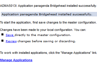Wait until you see the message "Application panagenda Bridgehead installed successfully" and click on Save: