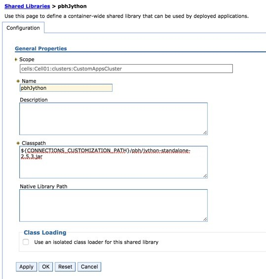 Enter "pbhJython" in the Name field and use a Classpath based on the Connections Customization directory, such as
