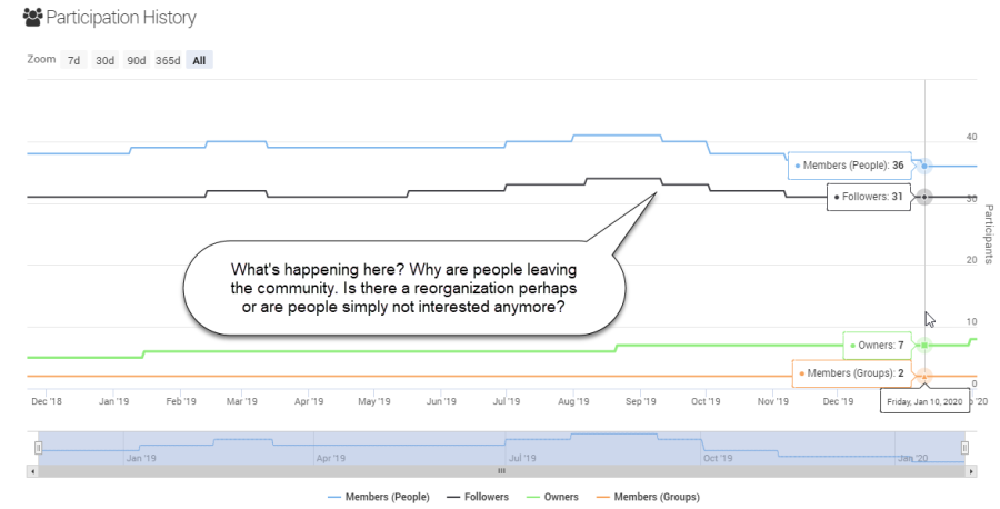Community Usage Analytics shows you the participation of your members and visitors, your Communities' most active content (blogs, wiki pages, files, etc.), as well as the type and number of activities that took place. This information can help you determine what is going on and what to focus on when you try to get people more involved.