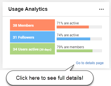 After adding the app to your Community you will see a small participation overview on your Community overview page. This shows you the current number of members, followers and the number of unique visitors to your Community in the last 30 days. To get to the full details, click the Go to details page or click the Community Usage Analytics tab from your Communities apps list.