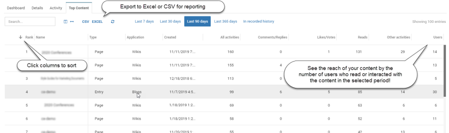 The last tab shows you how your content like blogs, files and wiki's are being used and which are popular or not. This page lists the top 100 content items in your Community with the number of users who interacted with it and the actions taken. It allows you to search, filter and export your top content list.