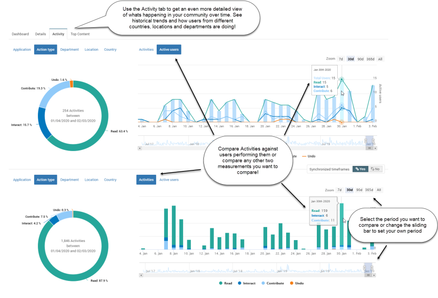 Knowing how many users alone though is not enough. So to see what they are doing, the analytics dashboard allows you to draw quick comparison overviews of number of activities and number of users per type of action, application, department location or country:
