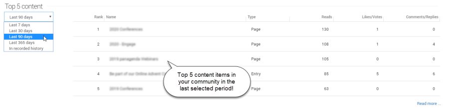 Lastly, the dashboard offers you a list of the top 5 Content items in your Community. These can be blog entries, files, wiki pages, forum topics and any other type of content your Community has.