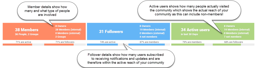 On the Dashboard tab, you will find the participation bar in the top, showing you how many users your Community reaches and how many are actually using it.