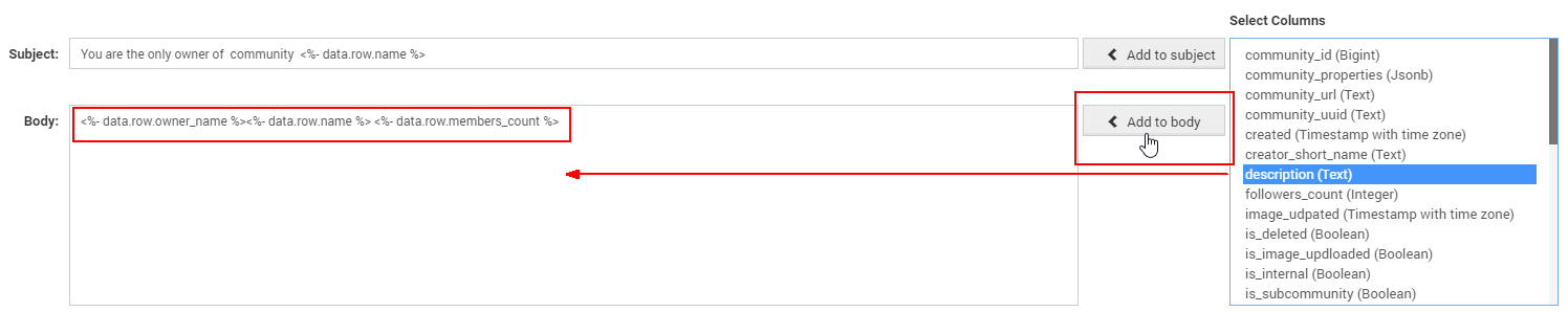 Insert all queries (Select Columns field) that you want to use in the notification into the Body field