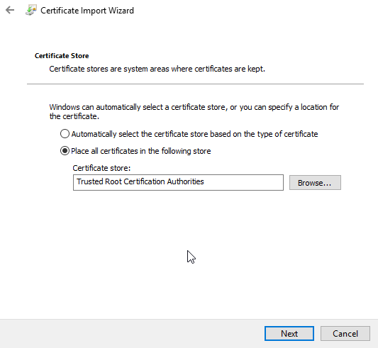 - Import the certificate into the trusted store of your computer. For me it always works best to put it into the 'Trusted Root Certificate Authorities' store.
