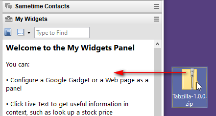 On the right-hand sidebar of your Notes client, you will see an icon for My Widgets. Click this to make the My Widgets panel visible, and drag-and-drop the Tabzilla zip file onto the panel: