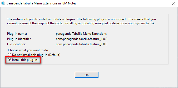 Choose the "Install this plug-in" option and click OK. Once the installation is complete, you will be prompted to restart the Notes client. After the client is restarted, the Tabzilla plugin will be active and running.