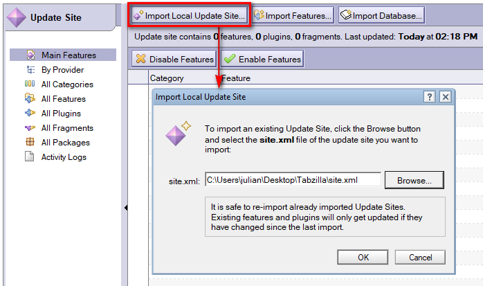 Unzip the Tabzilla zip file on your hard drive. In your Update Site database, click the Import Local Update Site button, browse to the site.xml file in the folder where you unzipped the Tabzilla files, and click OK: