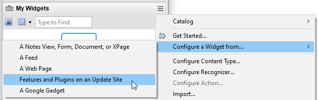 - Choose the menu option Configure a Widget from – Features and Plugins on an Update Site.