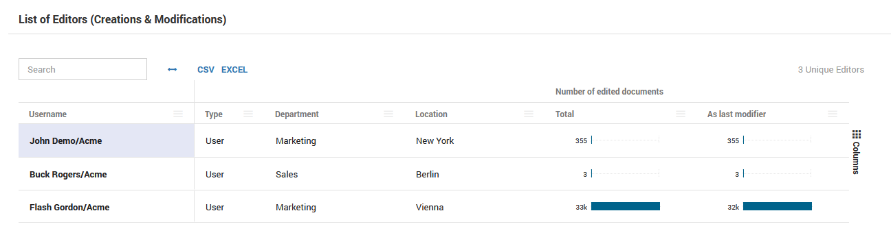 The list of document editors in the Content Analysis area of database details now holds information about user department and location. This new feature is especially useful when user names have to remain pseudonymized due to data protection regulations.