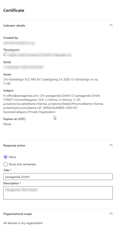 In case Microsoft Defender is being used, the simplest way would be to trust "panagenda" as the issuer in your environment based on the certificate signature. A possible config could look like the following. (> Agent Version 1.25.*)