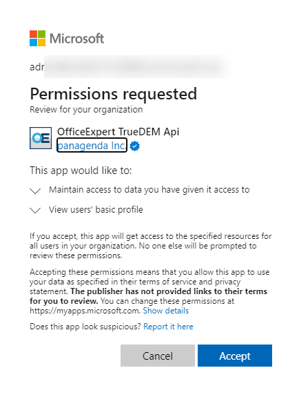 Click on Accept to add the OfficeExpert TrueDEM API - App to your Microsoft Entra ID.