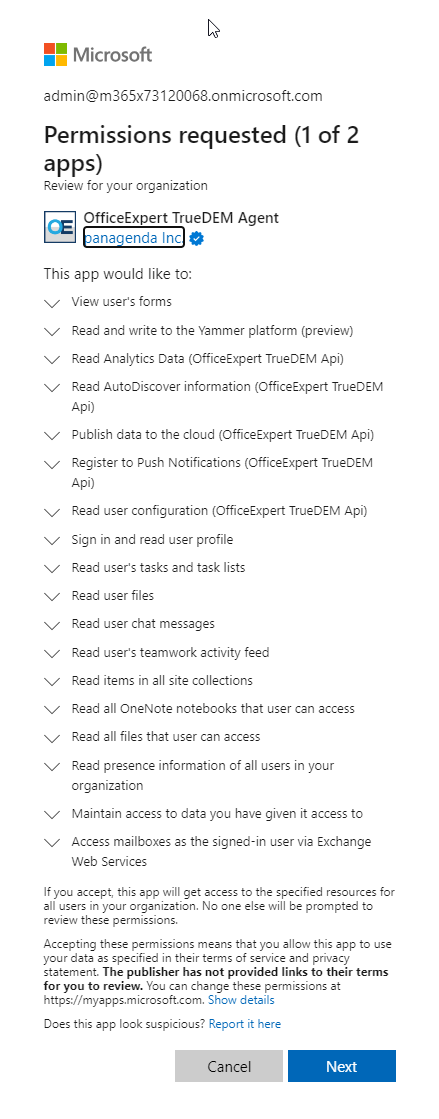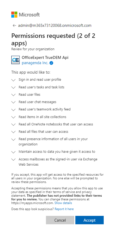 Click on Accept to add the OfficeExpert TrueDEM Agent - App to your Microsoft Entra ID.