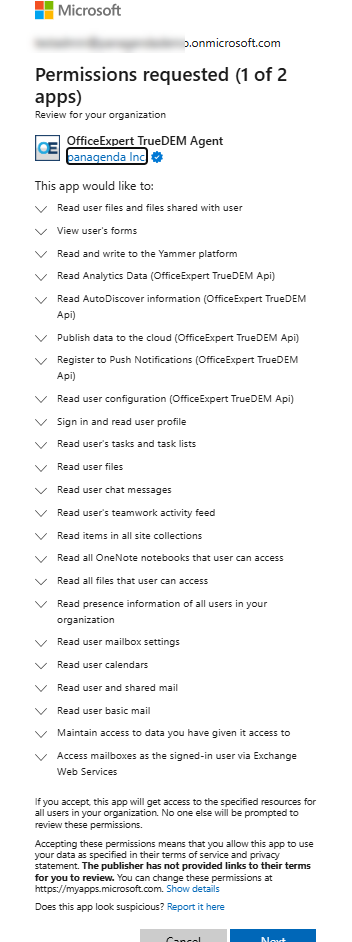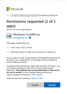 The second Dialog page is a re-confirmation since the TrueDEM Agent app is caling the other TrueDEM API app and one need to confirm the graph permissions again.