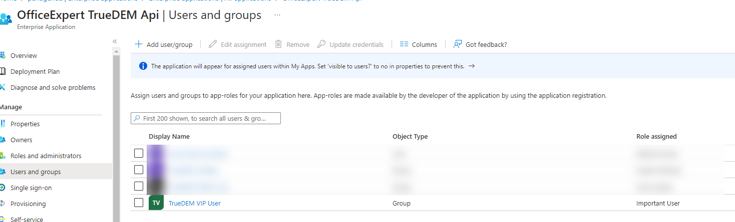 - Navigate to the OfficeExpert TrueDEM API app within Microsoft Entra ID