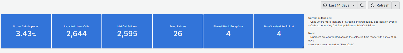 - Firewall Block Exception: Number of User Calls where MissingFWIPBlockExemptionRule got triggered. The issue could be related to either firewall and network reasons or other events where the call setup was unsuccessful.