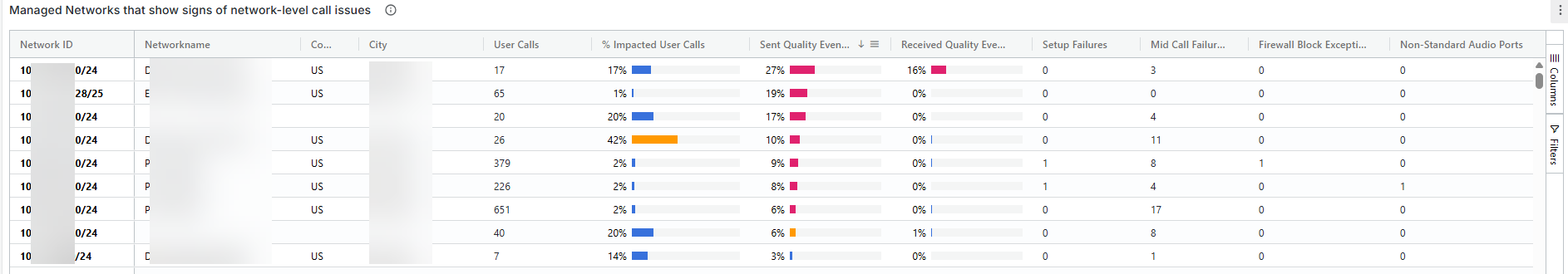 This report identifies managed networks with the highest ratios of poor-quality Teams calls focusing only on network-level data so that an admin can isolate and fix local network issues under IT control — even for peer-to-peer calls — and improve end-user experience. It mainly uses metrics that point to network specific problems: