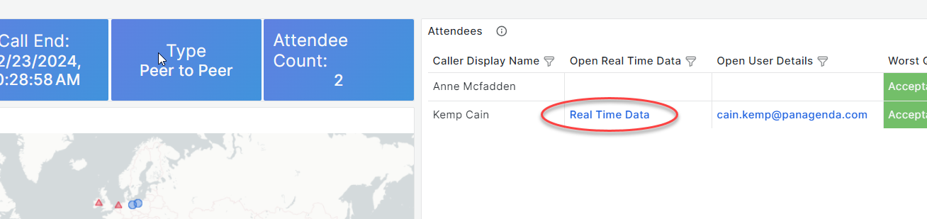 The attendee list shows you the attendees with an indicator of the their worst experience segment during the call. If real time data was collected for the attendee (requires the EPM agent), there will be a link to “Real Time Data”. This will give you specific real time metrics for the user and their device during the call. For users with an internal account, you will also see a link in the “Open User Details”.