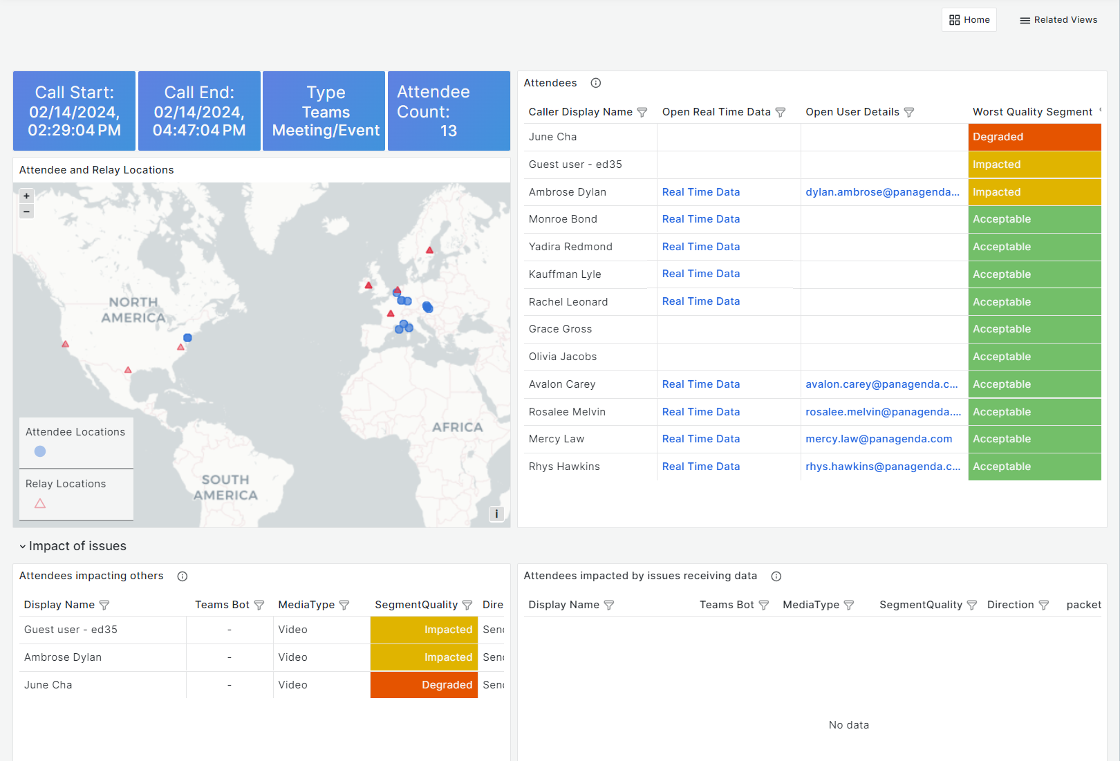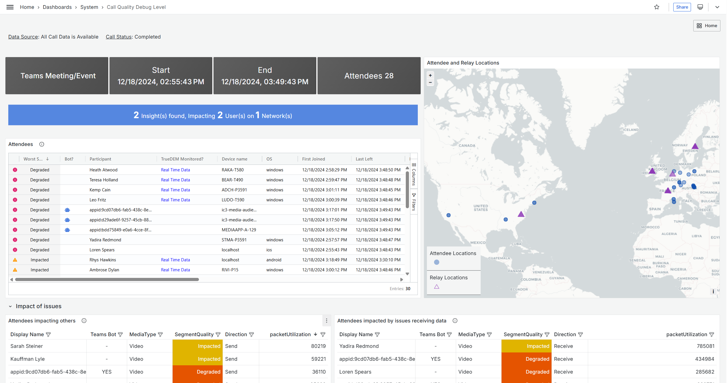 The attendee and relay map shows you where people are located and what relays were used during the call. The Insights banner shows when predetermined conditions appeared that could point at issues.