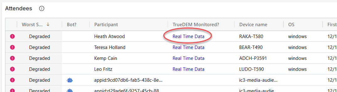 To see specific data collected by the OfficeExpert TrueDEM agent data directly from the device and Teams client click on the "Real Time Data" link in the participant table.