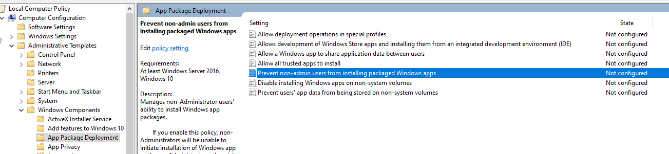 "Prevent non-admin users from installing packaged Windows apps" >>> Disabled or Not configed