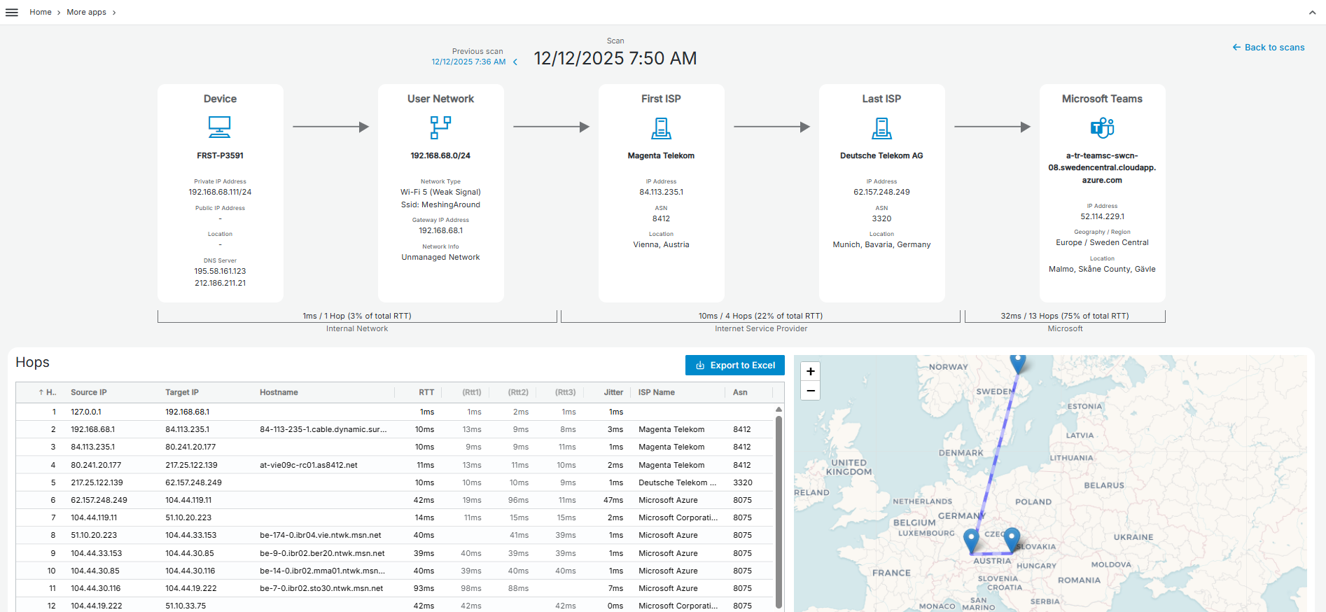 The connectivity journey table will show you all measurements that were taken, regardless of their completeness. A partial scan can happen, if too few ISP Hops or Microsoft Hops have been detected. This means that some hops are missing, and the connectivity journey is likely not complete. There are several reasons for this like network providers who sometimes hide or block certain traceroute data or parts of the network path. TCP Traceroute being blocked or CGNAT at the ISP level are common examples of this. If we detect this, we will indicate that scan results are potentially partial or inaccurate by placing a yellow exclamation mark icon next to the time column in the connectiviy journey scan result list and on the visualization itself. The results will still be listed with all hops we do detect.