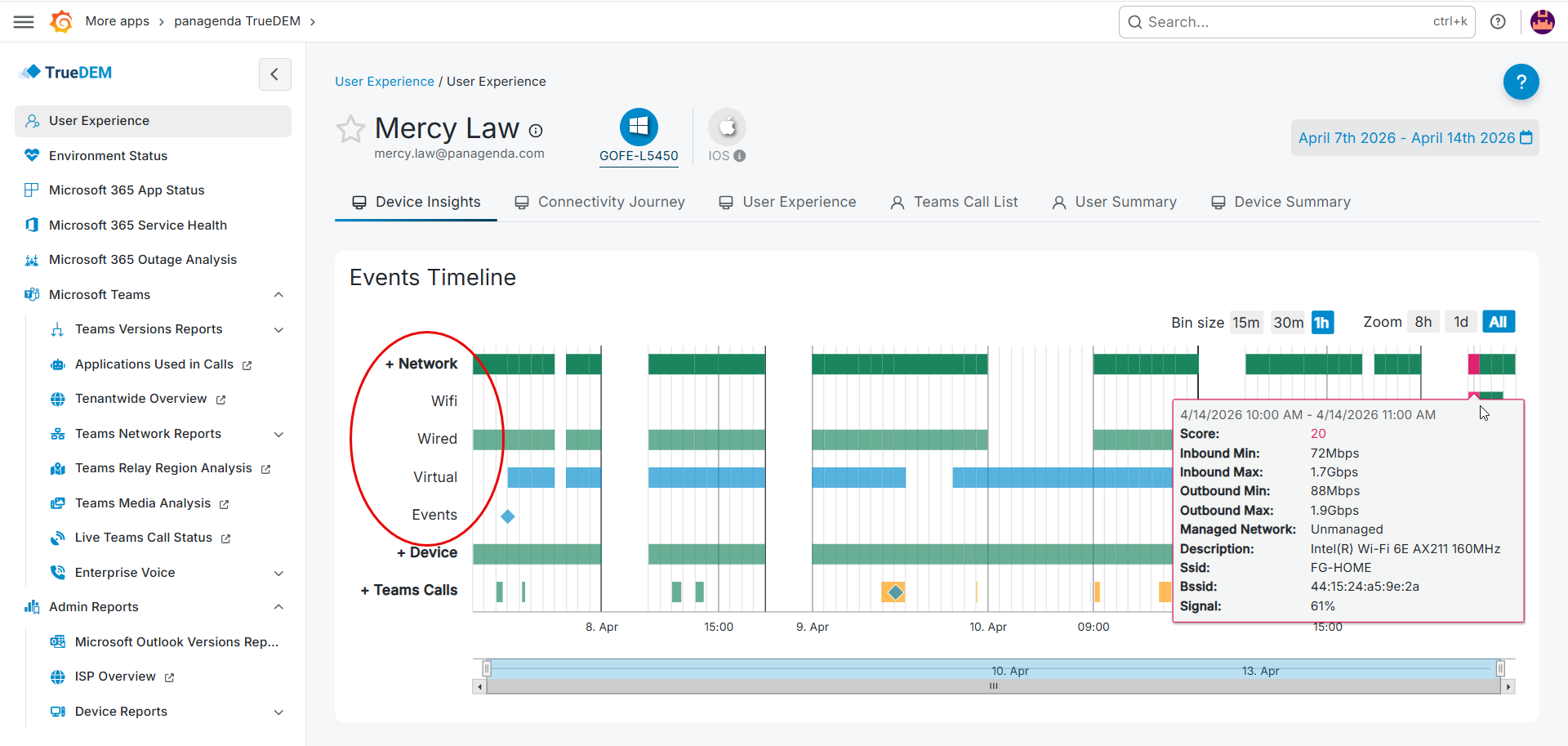 The Device Insights page shows an event line for Networking, Device and Call quality information for the selected device (in the top). It will provide a comprehensive and at-a-glance overview of a user's device activity over the last 7 to 21 days, aiming at showing you: “Everything about this user on this device that I need to see”. You can easily switch devices by using the device selection at the top.