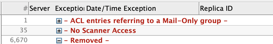 Databases are categorized by exception - one possible category being "- ACL entries referring to a Mail-Only group -":