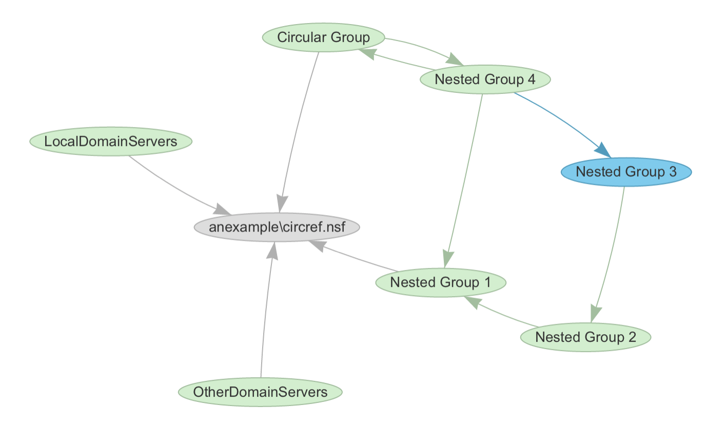 You can see, for example, that Nested Group 3 has access to the database because it is a subgroup of various other groups, even though it isn't listed explicitly in the ACL as a group. You can also see a circular reference between two of the groups, which doesn't cause any problems but might be a mistake in the Address Book.