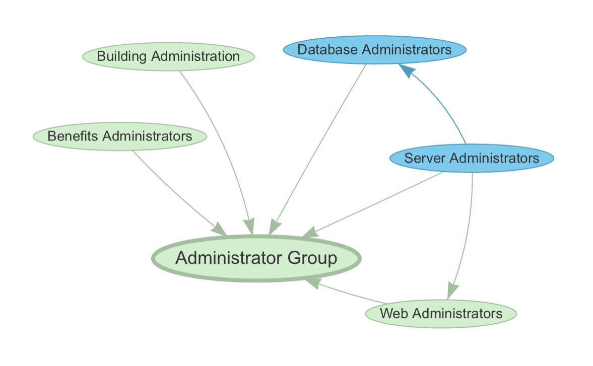 You can see that the Administrator Group (in the middle) has several direct subgroups – all the groups with a line pointing directly to the group in the middle are direct subgroups. You can also see that the Server Administrators group is both a direct subgroup of the Administrator Group, and also a subgroup of both Database Administrators and Web Administrators, which are then direct subgroups of the Administrator Group.