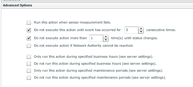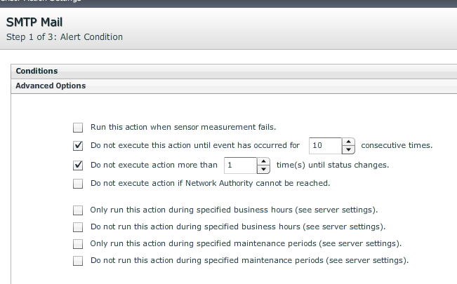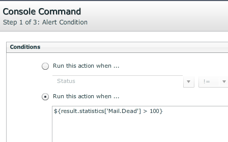 Define the same Condition but choose the following Advanced options (because we want to trigger only the SMTP e-mail if the previous console command did not solve the issue)