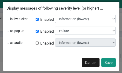Here you will see the live messages for all severity levels (default setting). You can adjust these settings by clicking on the cogwheel icon: